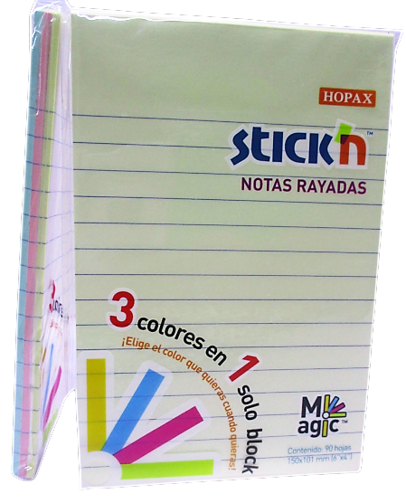 | Descripción: | BLOCK DE NOTAS ADHESIVAS MEDIDA 150 MM X 101 MM (6" X 4") 3 COLORES PASTEL RAYADA DE 90 HOJAS MODELO 21579 STICK´N MAE |
