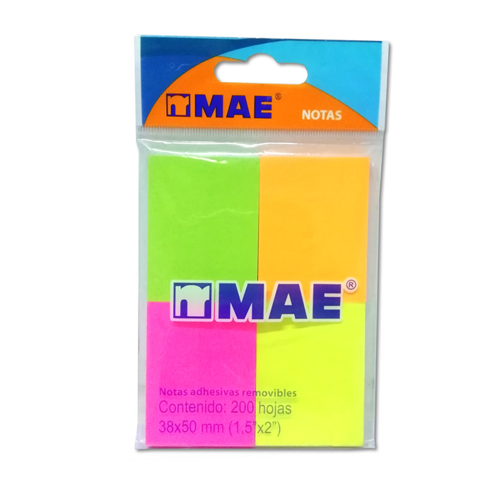 | Descripción: | BLOCK DE NOTAS ADHESIVAS MEDIDA 38 MM X 50 MM (1.5" X 2") 4 COLORES NEON DE 200 HOJAS MODELO 21091 MAE |