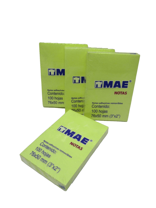 | Descripción: | BLOCK DE NOTAS ADHESIVAS MEDIDA 76 MM X 50 MM (3" X 2") COLOR AMARILLA DE 100 HOJAS POR PIEZA MODELO 21006P MAE |