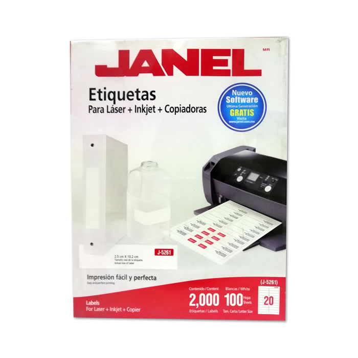 | Descripción: | ETIQUETAS BLANCAS JANEL MODELO J-5261 PARA LASER INKJET Y COPIADORAS MEDIDA 2.5 CM X 10.2 CM CON 100 HOJAS 20 ETIQUETAS POR HOJA |
