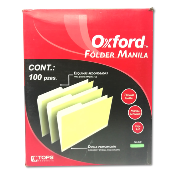 | Descripción: | FOLDER TAMAÑO CARTA EN CARTULINA DE 171 GRAMOS CON 1/2 CEJA Y PUNTAS REDONDEADAS CON DOBLE PERFORACION PARA BROCHE MEDIDAS 22 X 29.5 CMS COLOR VERDE MODELO M7501/2GRE OXFORD PAQUETE CON 100 PIEZAS |