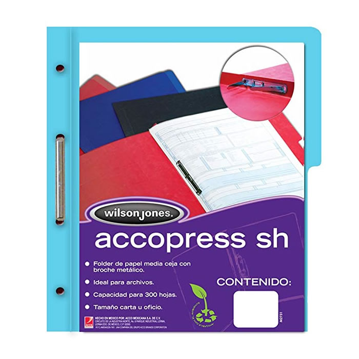 | Descripción: | FOLDER TAMAÑO CARTA EN CARTULINA PRESSBOARD DE 326 GRAMOS CON MEDIA CEJA Y PUNTAS REDONDEADAS CON BROCHE DE 8 CM MEDIDAS 25 X 29 CMS MODELO P4553 COLOR AZUL CLARO ACCOPRESS |