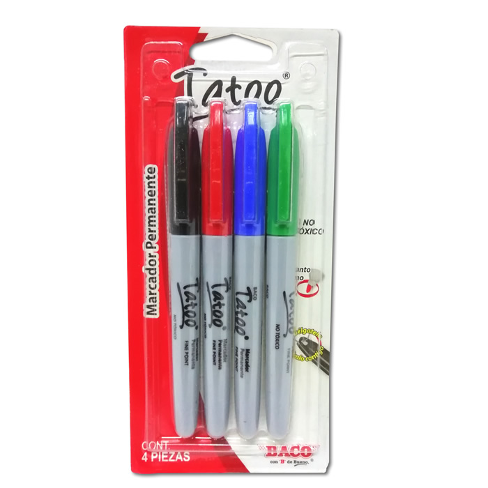 | Descripción: | MARCADOR PERMANENTE BACO TATOO CON 4 COLORES SURTIDOS PUNTO FINO |