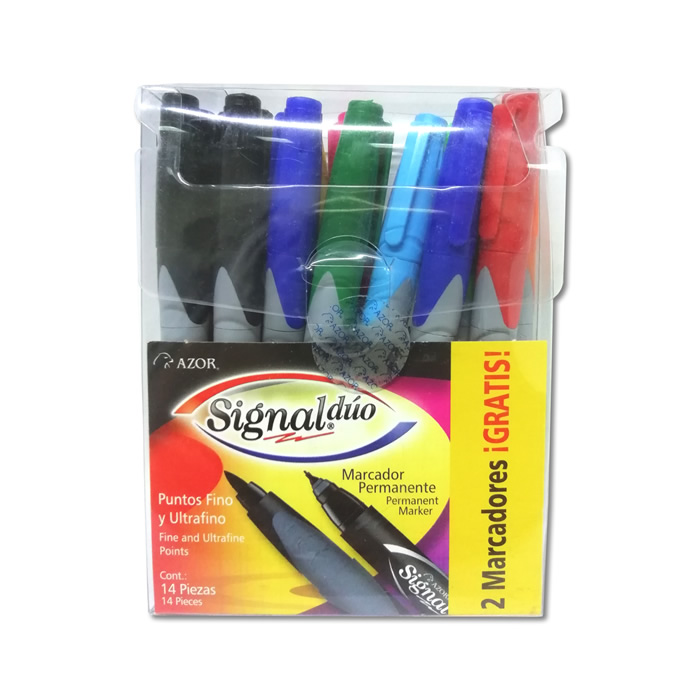 | Descripción: | MARCADOR PERMANENTE SIGNAL DUO CON 12 COLORES SURTIDOS MAS 2 GRATIS PUNTA FINA Y ULTRAFINA MODELO 3314CS AZOR |