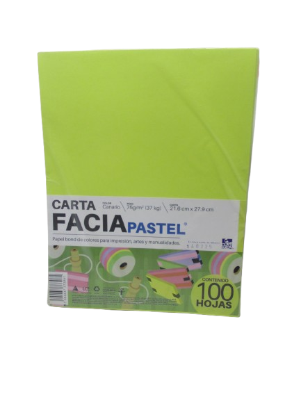 | Descripción: | HOJAS DE COLOR FACIA PASTEL AMARILLO CANARIO TAMAÑO CARTA 75 GRS CON 100 HOJAS |