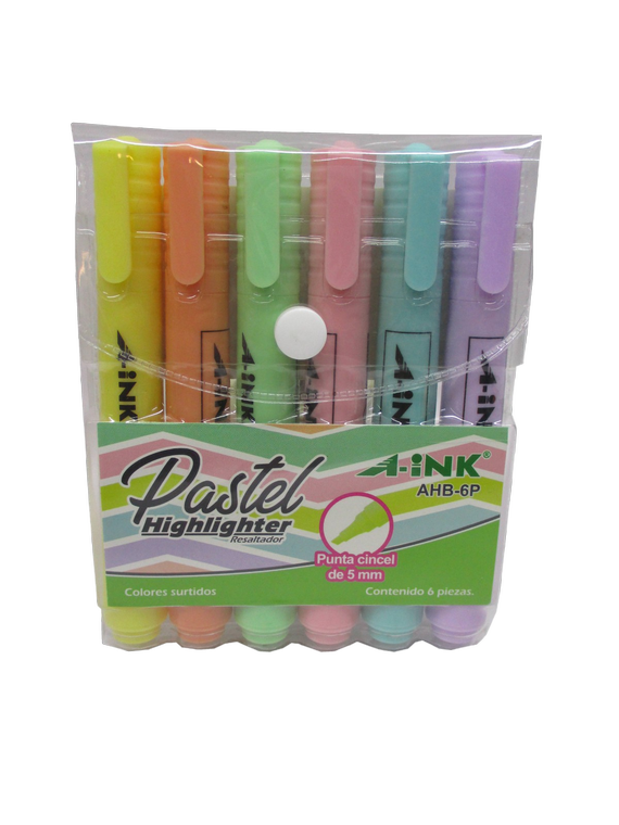 | Descripción: | RESALTADOR DE TEXTOS COLORES PASTEL SURTIDOS, A-INK, PUNTA DE CINCEL DE 5mm, ESTUCHE DE PLASTICO MODELO AHB-6P |