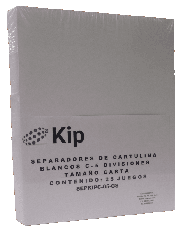 | Producto: | SEPARADORES BRISTOL TAMAÑO CARTA 5 SEPARADORES SIN PERFORACIONES KIP |