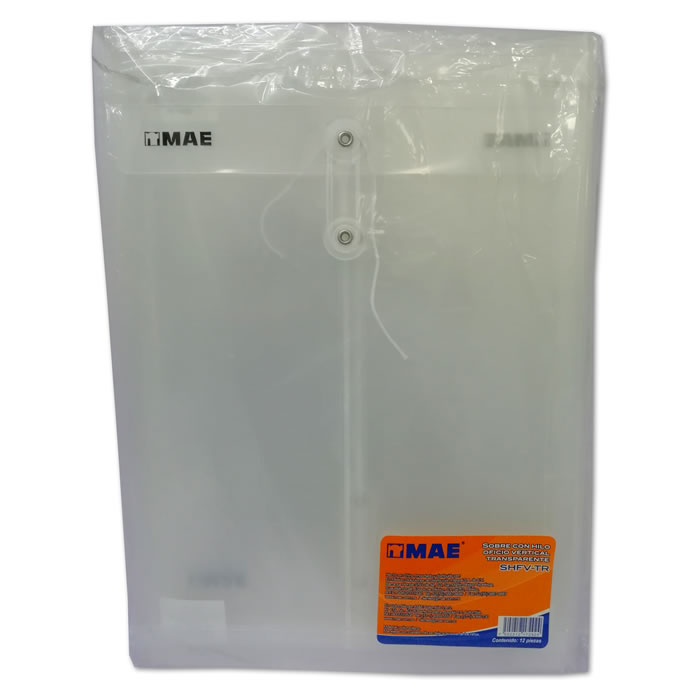 | Descripción: | SOBRE DE PLASTICO CON RONDANA E HILO FORMA VERTICAL TAMAÑO OFICIO MODELO SHFV-TR TRANSPARENTE MAE |