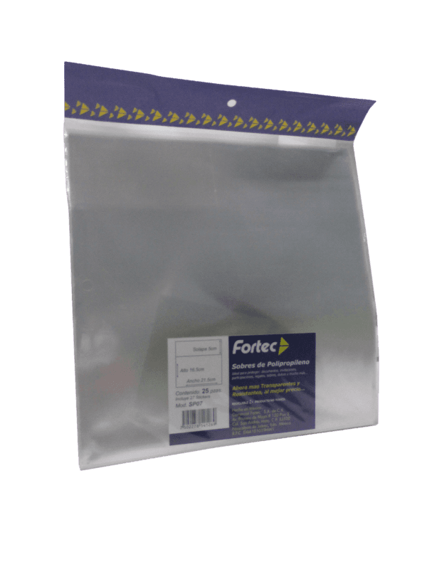 | Descripción: | SOBRE DE POLIPROPILENO TRANSPARENTE MEDIDA ALTO 21.5 CM, ANCHO 16.5 CM, SOLAPA 5 CM BOLSA CON 25 PIEZAS MODELO SP07 FORTEC |